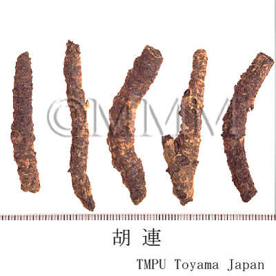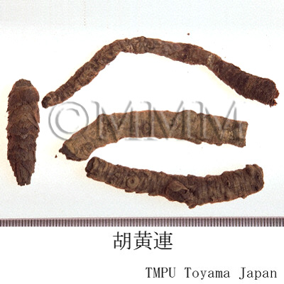 | 備考 | - 正倉院薬物の「黒黄連」は胡黄連で,このものの原植物は組織形態学(内鞘繊維の有無)及び成分化学(GC-MSによる比較)的検討から Picrorhiza scrophulariiflora であると考えられた.P. scrophulariiflora はネパール,中国のチベット自治区東南部,雲南省西北部及び四川省西部に分布する.『中華人民共和国薬典』収載品はこのものの根茎である.一方, P. kurrooa はインド,パキスタン,シッキム及びネパールなどに分布し,このものの根茎及び根はアーユルヴェーダで「Katuki」と称して黄疸,消化不良,発熱に用いられ,さらに現在では急性ウィルス性肝炎や気管支喘息にも応用されている. - 胡黄連は正倉院に納められてはいるが,大変高価で一般には入手不可能であった.そのため日本では代替品を探し,『証類本草』の附図からセンブリがこのものにあてられた.室町末期~江戸初期の頃であり,江戸初期にはそれが誤りであることに気づいている学者もいた.日本の民間薬としては代表的なセンブリ(当薬)はこうして開発された. - 中国東北諸省,朝鮮半島産の胡黄連はメギ科/Berberidaceae のタツタソウ(イトマキグサ)Jeffersonia dubia Benth. の根で 「鮮黄連」 ともいう. | |||||