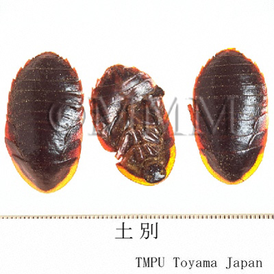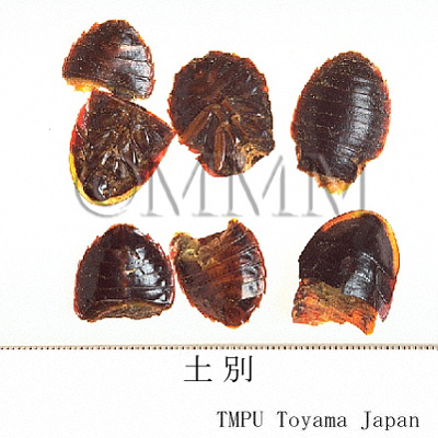 | 備考 | 基源動物は以下の通り. 1) シナゴキブリ (土鼈虫) Eupolyphaga sinensis Walker, 江蘇,浙江省産のものが,体がやや小さく,腹中に土を含まず,体が厚いわりに軽く品質良好で,「蘇土元」と称される.その他の地区のものは蘇土元より大型で,腹中に土を含み,重く品質次品である.「大土元」あるいは「漢土元」と称する. 2) サツマゴキブリ (東方后片蠊) Opisthoplatia orientalis Burmeister 本腫は,前胸背の前,側縁が淡黄色を呈しているので,「金辺土鼈」とも呼ばれる. 3) 冀地鼈 Polyphaga plancyi Bol. 北京に分布する. いずれも雌の全乾燥品が市販される.その他香港,台湾市場の䗪虫の一部は ゲンゴロウ科/Dytiscidaeの コガタノゲンゴロウ Cybister tripunctatus orientalis Gschew の乾燥虫体である. | |||||