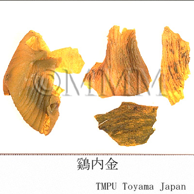 | 備考 | 中国ではニワトリの各種品種として「九斤鶏」,「狼山鶏」(岔河大鶏),「寿光鶏」,「大骨鶏」(大鶏, 高装鶏),「北京油鶏」,「桃源鶏」,「浦東鶏」(三黄鶏, 塘鶏),「来亨鶏」,「澳州黒鶏」などがある.香港市場品は恐らく「寿光鶏」(広東省産)のものであろう. 別名として「鶏肫皮」(遼寧, 山西, 山東, 湖北, 河南),「鶏針皮」(河北),「鶏中金」, 「化石胆」, 「化骨胆」(山西),「鶏合子」,「鶏膍胵」(山東),「鶏胃皮」(甘粛),「鶏食皮」,「鶏肚子」(河南),「鶏膆子」(新彊),「鶏灰皮」(江西),「鶏内筋」, 「鶏くん殻」(四川),「鶏肫子」(陜西),「鶏黄皮」(広西)などがある.ある地区では アヒル Anas platyrhnchos L. var. domesticus L. の胃の内壁である「鴨内金」を鶏内金にあてることがあるが,偽品である. | |||||