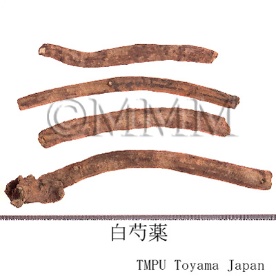 | 薬効 | 白芍: [性味] 苦、酸,微寒. [帰経] 肝、脾経. [効能] 養血調経,斂陰止汗,柔肝止痛,平抑肝陽. [主治] 血虚萎黄,月経不調,自汗,盗汗,脇痛,腹痛,四肢攣痛,頭痛眩暈に用いる. | ||||||