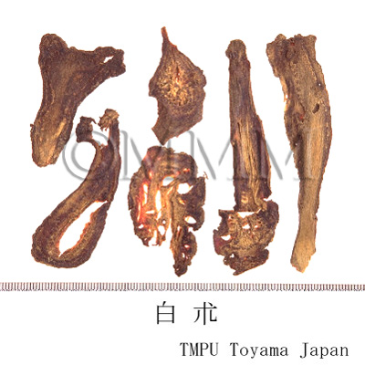 | 備考 | 日本及び韓国産は Atractylodes japonica の根茎の周皮を除いたもので,「三好白朮」,「玉白朮」,「嫩根白朮」などと称する.中国産白朮はすべて Atractylodes macrocephala を基源とし,産地及び加工法の違いにより「浙朮」,「天生朮」,「冬朮」,「野朮」など多様な呼称がある.『中華人民共和国薬典』に規定される白朮 (Atractylodis Macrocephalae Rhizoma, Largehead Atractylodes Rhizome) はこのものである.日本産白朮を「和白朮」,中国産白朮を「唐白朮」ともいう.2種ともに精油の主成分は atractylone である. 白朮とその同類生薬である蒼朮の薬効については,その健脾,燥湿を目的とするのは同じであるが,白朮は健脾(健胃)の力が比較的強く,蒼朮は燥湿(利水,利尿,発汗)の力が優るとされている.そのため,脾弱の虚証には白朮を用い,温盛の実証には蒼朮を多く用いる. | |||||