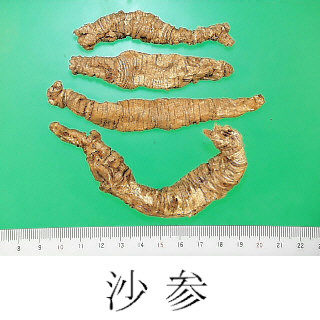 | 備考 | 中国産の沙参には南沙参と北沙参がある.キキョウ科の Adenophora属に由来するものを南沙参と称し,北沙参はセリ科のハマボウフウ Glehnia littoralis Fr. Schmidt et Miquel の外皮を去った根である.南沙参は去痰作用が強く,北沙参は滋陰の力が強いとされる. 韓国産の沙参はキキョウ科の Codonopsis lanceolata (Sieb. et Zucc.) Trautv. ツルニンジンの根である.この種は朝鮮名を「Totok」と言い,日本の「ととき」の語源になっている. 日本産の沙参はツリガネニンジン Adenophora triphylla A.DC. var. japonica Hara の根を主とする. | |||||