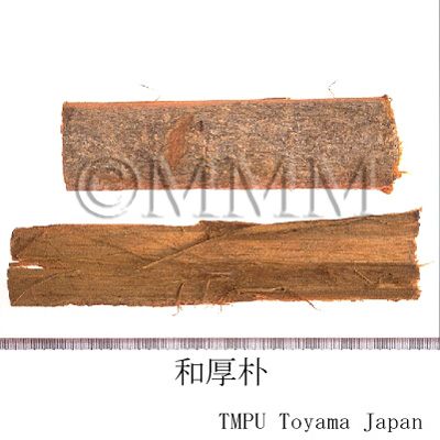 備考『日本薬局方』では3種の樹皮が規定され,magnolol を 0.8%以上含むこととされる.『中華人民共和国薬典』では厚朴(Magnoliae Officinalis Cortex)として M. officinalis の樹皮(川朴,湖北厚朴などと称す)と M. officinalis var. biloba(温朴,温州厚朴)の樹皮が規定される.樹皮(幹皮,枝皮)の他,根皮も用いられる.日本市場では中国産の厚朴を唐厚朴と総称する.韓国産はホオノキの樹皮以外に,クスノキ科のタブノキ Machilus thunbergii Sieb. et Zucc. の樹皮を「厚朴(薄朴)」と称し代用にすることがあるが,気味が全く異なる.