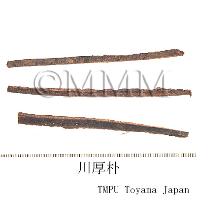 | 備考 | 『日本薬局方』では3種の樹皮が規定され,magnolol を 0.8%以上含むこととされる.『中華人民共和国薬典』では厚朴(Magnoliae Officinalis Cortex)として M. officinalis の樹皮(川朴,湖北厚朴などと称す)と M. officinalis var. biloba(温朴,温州厚朴)の樹皮が規定される.樹皮(幹皮,枝皮)の他,根皮も用いられる.日本市場では中国産の厚朴を唐厚朴と総称する.韓国産はホオノキの樹皮以外に,クスノキ科のタブノキ Machilus thunbergii Sieb. et Zucc. の樹皮を「厚朴(薄朴)」と称し代用にすることがあるが,気味が全く異なる. | |||||