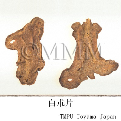 備考日本及び韓国産は Atractylodes japonica の根茎の周皮を除いたもので,「三好白朮」,「玉白朮」,「嫩根白朮」などと称する.中国産白朮はすべて Atractylodes macrocephala を基源とし,産地及び加工法の違いにより「浙朮」,「天生朮」,「冬朮」,「野朮」など多様な呼称がある.『中華人民共和国薬典』に規定される白朮 (Atractylodis Macrocephalae Rhizoma, Largehead Atractylodes Rhizome) はこのものである.日本産白朮を「和白朮」,中国産白朮を「唐白朮」ともいう.2種ともに精油の主成分は atractylone である.
