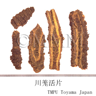 | 備考 | 韓国産の巻羌活はセリ科/Umbelliferae の チョウセンオニウド Ostericum koreanum Kitagawa (= Angelica koreana Maxim.) または ニオイウド Ostericum grosseserratum Kitagawa (= Angelica uchiyamana Yabe) の根と根茎である. また日本産の長羌活,巻羌活はともに シシウド Angelica pubescens Maxim. の根,根茎であるが,最近の和羌活はウコギ科 /Araliaceae のウド Aralia cordata Thunb. の根の細いものである. 中国産の独活はセリ科のAngelica属植物の根.羌活と独活はともに去風,勝湿の効があり,また痺を通じ,痛を止める.羌活は太陽経の薬で,燥散の性質が強く,よく発表,発汗させ,風寒表症に適用されるべきものである.独活は発表の効がなく,少陰腎経の薬で,細辛と共に用いて少陰の頭痛に効果がある.古人は羌活は遊風を治し,独活は伏風を治すといっており,また羌活は表に偏り,独活は裏に偏るともいっている. | |||||