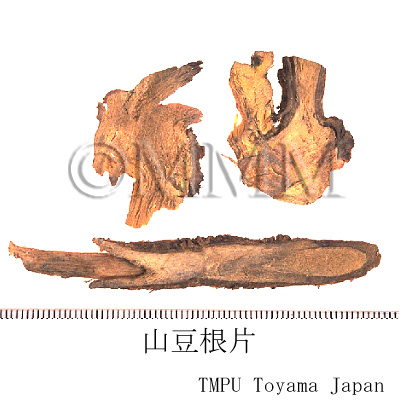 | 備考 | 山豆根の基源は数種類に及ぶ.現在中国から輸入される山豆根は Sophora属のもので,広西壮族自治区に主産する.東北,華北産の山豆根はツヅラフジ科の Menispermum dauricum DC. コウモリカズラの根茎(北豆根).湖北,河南,山西,甘粛,陜西,江蘇省などで用いられる山豆根はマメ科の Indigofera amblyantha Craib, I. fortunei Craib 及び I. ichangensis Craib など多種の Indigofera属植物の根である. | |||||
