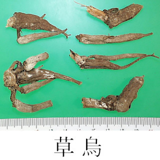 | 備考 | - 野生の Aconitum 属の塊根は「草烏頭」, 「草烏」, 「烏薬」, 「金牛七」, 「大草烏」, 「小黒牛」, 「血烏」, 「黄草烏」, 「藤草烏」, 「蔓烏薬」,「火焰子」, 「鉄棒鎚」など産地,種類によって名称が異なる. - 中国産草烏頭など:A. kusnezoffii(黒竜江), A. artemisaefolium Bar. et Skv.(遼寧), A. paniculigerum Nakai, A. sczukini Turcz.(以上, 東北地方), A. taipeicum Hand.-Mazz.(陝西), A. karakolicum Rap., A. soongaricum Stapf(以上, 新疆), A. sungpanense Hand.-Mazz.(陝西, 甘粛, 四川), A. hemsleyanum Pritz.(四川, 湖北, 湖南, 陝西), A. stylosum Stapf, A. transsectum Diels, A. delavayi Franch.(以上, 雲南) など多くのAconitum属植物の塊根. - 韓国産草烏頭:ミツバトリカブトA. triphyllum Nakai など数種のAconitum属植物の塊根. - 日本産草烏頭:オクトリカブトA. japonicum Thunb. の塊根. -『中華人民共和国薬典』には「川烏」(A. carmichaeli の母根,6月下旬~8月上旬採取)と「草烏」(A. kusnezoffii の塊根,秋季採取)が収載される.草烏の方が毒性及び効果が強い.烏頭は附子に比べて去風,鎮痛の効が勝り,強心,去寒の効は劣る. | ||||||