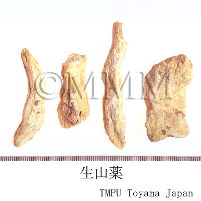 | 備考 | 日局18には ヤマノイモ Dioscorea japonica と ナガイモ D. batatas が,『中華人民共和国薬典 2020年版』には D. opposita がそれぞれ規定される.河南省の山薬は「淮山薬」,「淮山」と称され,D. opposita に由来し,一方広西壮族自治区の山薬は ダイジョ D. alata L. に由来する. 日本産の山薬は食用として栽培されたナガイモを原料とする.ナガイモは食用として広く栽培され,多数の品種がある.品種はナガイモ群,イチョウイモ群,丹波イモ群に大別される.ヤマノイモとの中間型もある. 台湾産の山薬は D. alata L. や D. doryphora Hance,その他偽品としてヒルガオ科 (Convolvulaceae)の アメリカイモ Ipomoea batatas (L.) Poir の塊根がある. 日本産と中国産では加工方法にも違いがあり,日本産は皮を剥いだ後そのまま加熱乾燥するが,中国産は圧縮して水分をある程度除去して乾燥する(毛条山薬)かまたはチョーク状に加工する(光山薬).日本産の品質が良いとされる. | ||||||