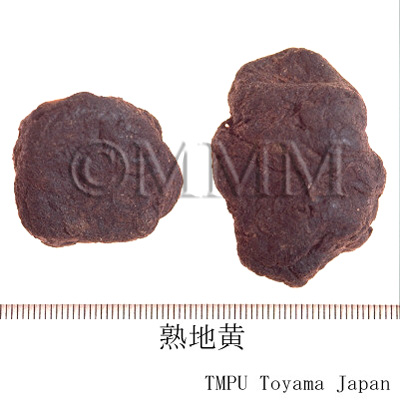 | 備考 | 酒製熟地:地黄に黄酒(紹興酒など)を加えて攪拌し,このものを蒸し器で蒸す.その後日光で乾燥する.「蒸す-乾燥」の操作を9回繰り返す. 蒸製熟地:黄酒を用いずに製する.「蒸す-乾燥」の操作を9回繰り返す.熟地黄は乾地黄に比し catalpol などのイリドイド配糖体が消失または著しく含量が減少し,一方単糖類の含量は増える傾向にある. | ||||||