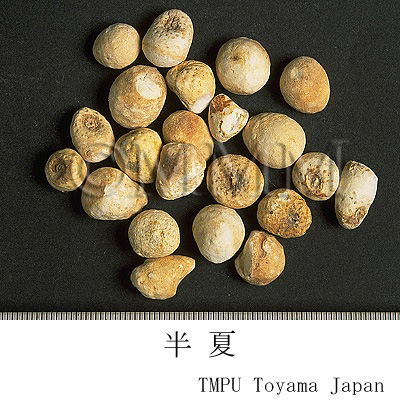 | 備考 | 半夏は加工(修治)して用いられることがあり,加工品には法半夏,姜半夏などがある.法半夏は甘草と生石灰,姜半夏は生姜と明礬をそれぞれ用いて加工する.法半夏は燥湿,化痰,姜半夏は降逆止嘔に多用される.中国産の半夏市場品中にまれに Pinellia pedatisecta Schott,P. tripartita Schott オオハンゲまたはテンナンショウ属 Arisaema spp. の塊茎が混入される.水半夏は Typhonium sp. の塊茎である. | |||||