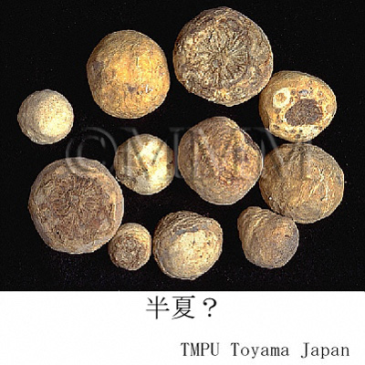 | 備考 | 半夏は加工(修治)して用いられることがあり,加工品には法半夏,姜半夏などがある.法半夏は甘草と生石灰,姜半夏は生姜と明礬をそれぞれ用いて加工する.法半夏は燥湿,化痰,姜半夏は降逆止嘔に多用される.中国産の半夏市場品中にまれに Pinellia pedatisecta Schott,P. tripartita Schott オオハンゲまたはテンナンショウ属 Arisaema spp. の塊茎が混入される.水半夏は Typhonium sp. の塊茎である. | |||||