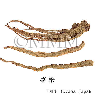 | 備考 | Codonopsis pilosula ヒカゲツルニンジンの根は中国において「党参」の名で繁用される.しかし韓国にはこの名称の生薬はなく,代わって「蔓参」の名で民間的に使用されていた.「蔓参」市場品中にC. lanceolata Trautv. ツルニンジンの根が見られたが,これは韓国産「沙参」の原植物である(中国産沙参はAdenophora属植物).C. lanceolata の根は中国で「羊乳」と称し,補血催乳,養陰潤肺,清熱解毒,消腫排膿薬にされる. | |||||