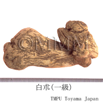 | 備考 | 日本及び韓国産は Atractylodes japonica の根茎の周皮を除いたもので,「三好白朮」,「玉白朮」,「嫩根白朮」などと称する.中国産白朮はすべて Atractylodes macrocephala を基源とし,産地及び加工法の違いにより「浙朮」,「天生朮」,「冬朮」,「野朮」など多様な呼称がある.『中華人民共和国薬典』に規定される白朮 (Atractylodis Macrocephalae Rhizoma, Largehead Atractylodes Rhizome) はこのものである.日本産白朮を「和白朮」,中国産白朮を「唐白朮」ともいう.2種ともに精油の主成分は atractylone である. 白朮とその同類生薬である蒼朮の薬効については,その健脾,燥湿を目的とするのは同じであるが,白朮は健脾(健胃)の力が比較的強く,蒼朮は燥湿(利水,利尿,発汗)の力が優るとされている.そのため,脾弱の虚証には白朮を用い,温盛の実証には蒼朮を多く用いる. | |||||