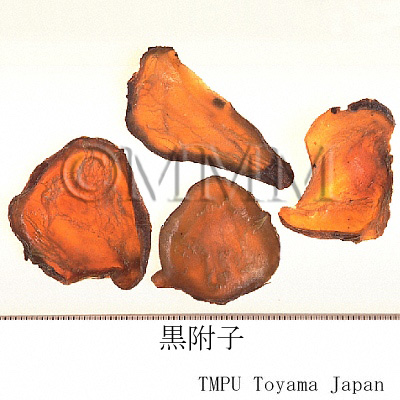 - 黒附片, 熟附片:にがり水に浸けた後縦切りにし,調色剤で染色,蒸してから乾燥したもの.