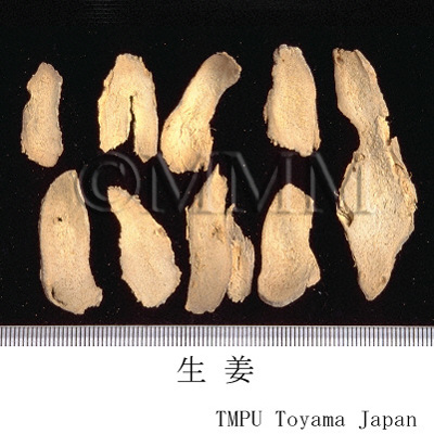 備考古来,漢方処方で用いられる生姜は,いわゆる新鮮なショウガのことで,乾姜は乾燥品である.したがって,漢薬市場の乾燥した生姜(乾生姜とも称す)は,漢方でいう乾姜を指す.では市場の乾姜は何かというと,生姜を蒸乾したもので,修治品(加工品)といえる.一方,現在中国では新鮮なものが生姜で,乾燥品が乾姜である.また修治品として炮姜がある.炮姜は先ずきれいな砂(蛤粉,滑石粉)を鍋に入れ,強火で熱した後,乾燥した皮付き生姜を入れて攪拌し,表面が盛り上がって褐色になったら取出し放冷したものである.
