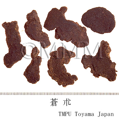 | 備考 | 茅朮(毛朮,漢蒼朮)は A. lancea ホソバオケラ(湖北,江西,江蘇省などに産す),津蒼朮(山蒼朮)は A. chinensis シナオケラ(河北,河南,山西省に産す),北鮮蒼朮は A. koreana Kitam. (= A. lancea DC. var. simplicifolia Kitam.) ナンマンオケラ(吉林,遼寧省,朝鮮半島北部に産す),韓蒼朮は A. japonica Koidz. オケラ(中国東北地方,朝鮮半島,日本に産す)である.江蘇省茅山産の茅朮は品質のよいものとして特に有名である.精油成分が蒼朮の表面に,白色の綿状に析出し,カビと見誤ることが多いが,beta-Eudesmol と Hinesol の混晶であり,良質のものである証拠である. 近年,精油成分の特徴から,A. lancea には茅山型,湖北・安徽型,大別山型があり,A. chinensis には北部型と南部型があることが報告されている.A. lancea, A. chinensis, A. koreana に由来する蒼朮は Atractylodin を共通して含み,これを含まない A. japonica 及び A. ovata 由来の白朮とは明瞭に区別される. | |||||