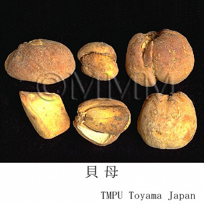 | 備考 | 貝母は種類が多く,主なものには次のものがある. - 浙貝母 (浙貝) : Fritillaria thunbergii Miq. - 湖北貝母:F. hupehensis Hsiao et K.C. Hsia - 川貝母 (川貝) : F. cirrhosa D.Don, F. unibracteata Hsiao et K.C.Hsia, F. przewalskii Maxim. - 炉貝:F. delavayi Franch. - 伊貝母 (伊貝) : F. pallidiflora Schrenk, F. walujewii Regel - 平貝母 (平貝) : F. ussuriensis Maxim. これらは,『中華人民共和国薬典』にそれぞれ別の条項で収載される(炉貝は川貝母に含まれる).貝母は化痰薬とされるが大きく,浙貝母,湖北貝母のグループと川貝母,炉貝,伊貝,平貝のグループに分けられ,前者は咳嗽の他,瘰癧や癰腫瘡毒にも応用され,後者は陰虚や肺熱の咳嗽に応用される. 日本産貝母は浙貝母と同じアミガサユリ(バイモ)の鱗茎で奈良県で栽培され,「大和貝母」とも称される.烏頭類生薬といっしょに用いてはならない. | |||||