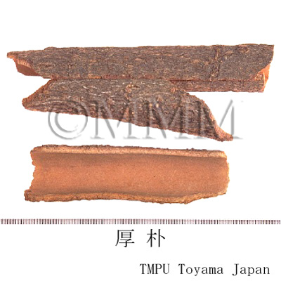 | 備考 | 『日本薬局方』では3種の樹皮が規定され,magnolol を 0.8%以上含むこととされる.『中華人民共和国薬典』では厚朴(Magnoliae Officinalis Cortex)として M. officinalis の樹皮(川朴,湖北厚朴などと称す)と M. officinalis var. biloba(温朴,温州厚朴)の樹皮が規定される.樹皮(幹皮,枝皮)の他,根皮も用いられる.日本市場では中国産の厚朴を唐厚朴と総称する.韓国産はホオノキの樹皮以外に,クスノキ科のタブノキ Machilus thunbergii Sieb. et Zucc. の樹皮を「厚朴(薄朴)」と称し代用にすることがあるが,気味が全く異なる. | |||||
