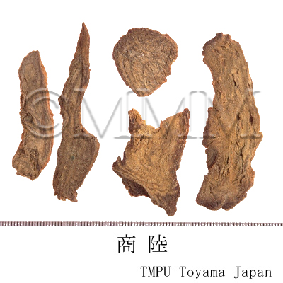| 備考 | 中国には商陸の異物同名品が多い. Ipomoea digitata L., ヒルガオ科/Convolvulaceae: 福建省の一部で栽培し,その根を商陸として出荷する.広西省では野商陸と称す. Melastoma normale D. Don, ノボタン科/Melastomataceae: 四川省楽山専区でこの根の斜切片を商陸と称して出荷する.また Osbeckia crinita Benth. の根も混用される.これらのものには行気,活血,清熱の効があり,正條品商陸と薬効が異なる. Gypsophila dahurica Tur., ナデシコ科/Caryophyllaceae: 黒龍江省で商陸に充てる. Gypsophila oldhamiana Miq.: 山西,遼寧,内蒙古,湖北省などで商陸とする. Gypsophila pacifica Komar. : 東北地区で商陸とする. これら Gypsophila属のものは本来 「山銀柴胡」 と称すべきものである. Anisodus tangutica Maxim., ナス科/Solanaceae: かつてこれの根を青海省で商陸と称し出荷し,アトロピン中毒を引き起こしたことがある.本品の土名章柳神と商陸の別名章柳根を誤って混同したためである. Costus speciosus (Koenig) Smith, ショウガ科/Zingiberaceae: 広東省でこの根茎を商陸と称す. | |||||