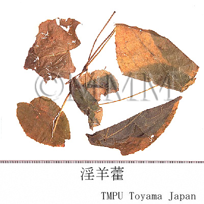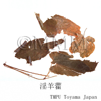 | 備考 | 『中華人民共和国薬典』 (2020) には「淫羊藿」として Epimedium brevicornum Maxim., E. sagittatum Maxim., E. pubescense Maxim., E. koreanum Nakai の地上部が規定される. 中国四川省産の淫羊藿は E. pubescens, E. acuminatum Franch., E. wushanense, E. sutchuenense Franch. and E. davidii Franch.などが主流である. 中国東北部および朝鮮半島北部産淫羊藿は E. koreanum Nakai およびキバナイカリソウ E. cremeum Nakai であろう. 日本産はイカリソウ E. grandiflorum Morr. var. thunbergianum Nakai (長野県産) およびウラジロイカリソウ E. sempervirens Nakai var. hypoglaucum Ohwi (新潟県産)の 葉または地上部を乾燥したもの.日本では地下部を「イカリソウ根」と称して別に市販される (B2). | ||||||