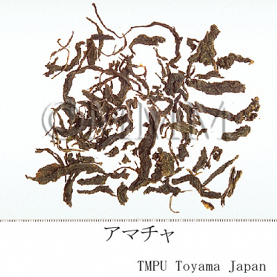 | 備考 | 葉はもんでやや発酵させたもので,加工過程上ちぢれている.生の葉には甘味は無く,発酵させ手でもむ等の調製により,加水分解生成物 phyllodulcin (甘味成分) が生じる.アマチャは江戸時代にその煎汁を灌仏会 (4月8日) の甘茶湯として用いたもので,薬用の歴史は浅い. | |||||