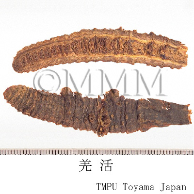 | 備考 | 韓国産の巻羌活はセリ科/Umbelliferae の チョウセンオニウド Ostericum koreanum Kitagawa (= Angelica koreana Maxim.) または ニオイウド Ostericum grosseserratum Kitagawa (= Angelica uchiyamana Yabe) の根と根茎である. また日本産の長羌活,巻羌活はともに シシウド Angelica pubescens Maxim. の根,根茎であるが,最近の和羌活はウコギ科 /Araliaceae のウド Aralia cordata Thunb. の根の細いものである. 中国産の独活はセリ科のAngelica属植物の根.羌活と独活はともに去風,勝湿の効があり,また痺を通じ,痛を止める.羌活は太陽経の薬で,燥散の性質が強く,よく発表,発汗させ,風寒表症に適用されるべきものである.独活は発表の効がなく,少陰腎経の薬で,細辛と共に用いて少陰の頭痛に効果がある.古人は羌活は遊風を治し,独活は伏風を治すといっており,また羌活は表に偏り,独活は裏に偏るともいっている. | |||||