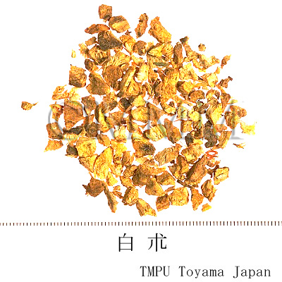 | 備考 | 日本及び韓国産は Atractylodes japonica の根茎の周皮を除いたもので,「三好白朮」,「玉白朮」,「嫩根白朮」などと称する.中国産白朮はすべて Atractylodes macrocephala を基源とし,産地及び加工法の違いにより「浙朮」,「天生朮」,「冬朮」,「野朮」など多様な呼称がある.『中華人民共和国薬典』に規定される白朮 (Atractylodis Macrocephalae Rhizoma, Largehead Atractylodes Rhizome) はこのものである.日本産白朮を「和白朮」,中国産白朮を「唐白朮」ともいう.2種ともに精油の主成分は atractylone である. 白朮とその同類生薬である蒼朮の薬効については,その健脾,燥湿を目的とするのは同じであるが,白朮は健脾(健胃)の力が比較的強く,蒼朮は燥湿(利水,利尿,発汗)の力が優るとされている.そのため,脾弱の虚証には白朮を用い,温盛の実証には蒼朮を多く用いる. | |||||