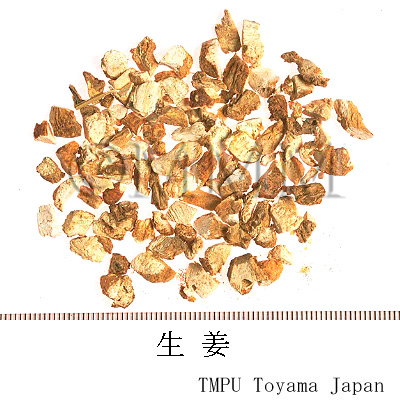 | 薬理作用 | 中枢抑制([6]-gingerol,[6]-shogaol).鎮痛([6]-shogaol).プロスタグランジン生合成阻害([6]-gingerol,[6]-dehydrogingerone).鎮痙(精油).伝導麻酔(水エキス).抗腫瘍(水エキス).嘔吐抑制(生姜汁). | |||||