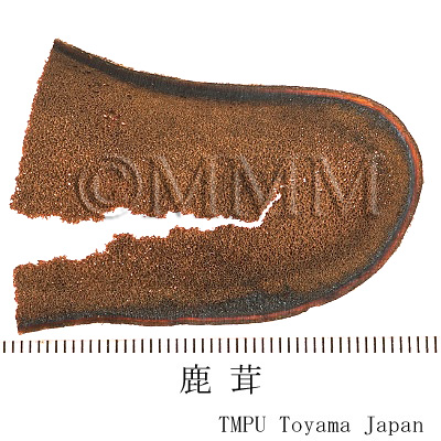 | 備考 | 脊椎動物門,哺乳綱(Mammalia),偶蹄目(Artiodactyla)のシカ科のマンシュウアカジカ Cervus (Cervus) elaphus L. var. xanthopygus Milne-Edwards(馬鹿),およびマンシュウジカ C. (Sika) nippon Temminck var. mantchuricus Swinhoe(梅花鹿,花鹿)の雄の幼角(袋角). 前者の幼角を「馬鹿茸」,後者からのものを「花鹿茸」または、「梅花鹿茸」と称しており,現在わが国に輸入される中国およびシベリア産のものはこの2種に限られ,特に前者が主である. | |||||