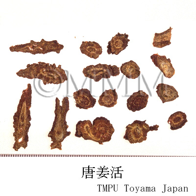 | 備考 | 韓国産の巻羌活はセリ科/Umbelliferae の チョウセンオニウド Ostericum koreanum Kitagawa (= Angelica koreana Maxim.) または ニオイウド Ostericum grosseserratum Kitagawa (= Angelica uchiyamana Yabe) の根と根茎である. また日本産の長羌活,巻羌活はともに シシウド Angelica pubescens Maxim. の根,根茎であるが,最近の和羌活はウコギ科 /Araliaceae のウド Aralia cordata Thunb. の根の細いものである. 中国産の独活はセリ科のAngelica属植物の根.羌活と独活はともに去風,勝湿の効があり,また痺を通じ,痛を止める.羌活は太陽経の薬で,燥散の性質が強く,よく発表,発汗させ,風寒表症に適用されるべきものである.独活は発表の効がなく,少陰腎経の薬で,細辛と共に用いて少陰の頭痛に効果がある.古人は羌活は遊風を治し,独活は伏風を治すといっており,また羌活は表に偏り,独活は裏に偏るともいっている. | |||||