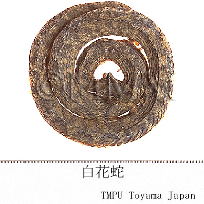 | 備考 | Agkistorodon acutus Gunther(蕲蛇,五歩蛇,白蛇,百歩蛇,棋盤蛇,褰鼻蛇,响尾蛇)の腹部を開いて内臓を取り出し,開いたまま円形平盤状になし炭火で乾燥したものを 「鯗蕲蛇」 と称し,内臓を取り出して開かず原形のまま円形にとぐろを巻かせて円盤状にし,炭火で乾燥したものを 「棍蕲蛇」 と称する.このヘビは薬用にするため江西省貴溪の祁盤山で培養しており,「祁蛇」,「正祁蛇」 とも称している. | |||||