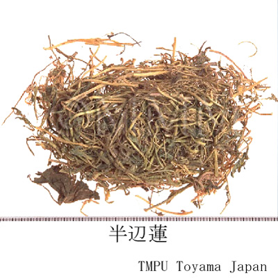 | 薬理作用 | 半辺蓮の浸剤を麻酔犬に0.1g/㎏静脈注射すると顕著な持続性の利尿作用があり,同時に血圧降下を伴う.同量を十二指腸に注入するとやはり利尿作用があるが,血圧は下らない.ジエチルエーテル抽出物でも同様の利尿効果がある.開花後の半辺蓮の利尿作用は開花前のものに比べ強く,煮沸しても利尿作用に影響がないが,150℃,24時間熱を加えると効力を失う.正常人にその煎剤を内服さすと,尿量,塩化物およびナトリウム排出量が顕著に増加する.半辺蓮の浸剤を麻酔犬に静脈注射すると,少量で呼吸興奮および血圧やや上昇作用があり,多量では持続性の呼吸興奮および血圧降下作用があり,5時間前後持続する.呼吸興奮作用は頚動脈の化学受容体を興奮させその反射により呼吸中枢を興奮させることによる.血圧降下作用は迷走神経の興奮性を亢め,心臓を直接抑制するものであろう.また多量での血圧降下作用は,血管運動中枢と心筋を直接的に抑制するためであろう.その他マウスの腹腔内に煎剤を注射すると出血時間を短縮させる.またその煎剤は試験管内で抗真菌作用がある. | |||||