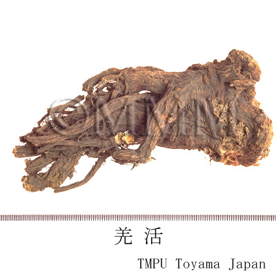 | 備考 | 韓国産の巻羌活はセリ科/Umbelliferae の チョウセンオニウド Ostericum koreanum Kitagawa (= Angelica koreana Maxim.) または ニオイウド Ostericum grosseserratum Kitagawa (= Angelica uchiyamana Yabe) の根と根茎である. また日本産の長羌活,巻羌活はともに シシウド Angelica pubescens Maxim. の根,根茎であるが,最近の和羌活はウコギ科 /Araliaceae のウド Aralia cordata Thunb. の根の細いものである. 中国産の独活はセリ科のAngelica属植物の根.羌活と独活はともに去風,勝湿の効があり,また痺を通じ,痛を止める.羌活は太陽経の薬で,燥散の性質が強く,よく発表,発汗させ,風寒表症に適用されるべきものである.独活は発表の効がなく,少陰腎経の薬で,細辛と共に用いて少陰の頭痛に効果がある.古人は羌活は遊風を治し,独活は伏風を治すといっており,また羌活は表に偏り,独活は裏に偏るともいっている. | |||||