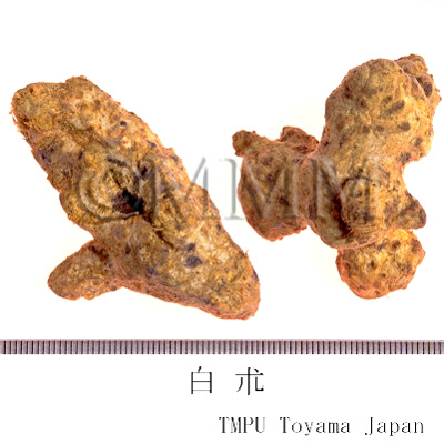 | 備考 | 日本及び韓国産は Atractylodes japonica の根茎の周皮を除いたもので,「三好白朮」,「玉白朮」,「嫩根白朮」などと称する.中国産白朮はすべて Atractylodes macrocephala を基源とし,産地及び加工法の違いにより「浙朮」,「天生朮」,「冬朮」,「野朮」など多様な呼称がある.『中華人民共和国薬典』に規定される白朮 (Atractylodis Macrocephalae Rhizoma, Largehead Atractylodes Rhizome) はこのものである.日本産白朮を「和白朮」,中国産白朮を「唐白朮」ともいう.2種ともに精油の主成分は atractylone である. 白朮とその同類生薬である蒼朮の薬効については,その健脾,燥湿を目的とするのは同じであるが,白朮は健脾(健胃)の力が比較的強く,蒼朮は燥湿(利水,利尿,発汗)の力が優るとされている.そのため,脾弱の虚証には白朮を用い,温盛の実証には蒼朮を多く用いる. | |||||