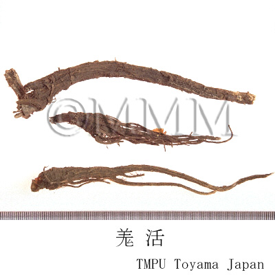 Chinese Qianghuo is the root of genus Angelica of family Umbelliferae. Both Qianghuo and Duhuo (Araliae Cordatae Rhizoma) have benefits of expelling wind and removing dampness. They relieves pain and removes palsy as well. Qianghuo is a medicine of Taiyang meridians. It has the advantage of expelling dryness and diaphoresis, and should be used for exterior syndrome due to wind cold, while Duhuo has no effect of diaphoresis. Duhuo is a drug of Yin Minimum Kidney Meridian, and used with Xixin (Asiasari Radix), which has a beneficial effects on headache resulting from Yin Minor Channel. In ancient times, it was said "Qianghuo cures hives and Duhuo cures latent wind. Qianghuo tends to specialize in the exterior and Duhuo tends to specialize in the interior."