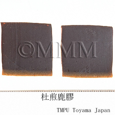 | Remarks | Santō Akyō (Jap. name), produced in Shandong Prov., is of fair quality. Japanese Ejiao is made from the skin, bone and tendon of cows, pigs and whales. Though, cow's skin and bone are often used, it is not for medicinal but for industrial use. Therefore, gelatinum is often substituted for Ejiao in Japan. "Tamaakyō" is the heated and swelled fragments of Ejiao. It is not appropriate to use it as Ejiao since the quality of the original glue is uncertain and it is processed using high temperatures. "Rokkakukyō" and "Rokujōkyō", made from deer horn and pilose antler respectively, are high quality. Their medicinal virtues are slightly different from Ejiao. They are used as medicine for warming the spleen and liver, and strengthening essence and tonifying the blood. They are applied for impotence and spermatorrhea, cold pain of loin and knee, macerating and consumptive disease, metrorrhagia and metrostaxis, melaena, hematochezia and hematuria, cellulitis of Yin and pain of swelling. | |||||
