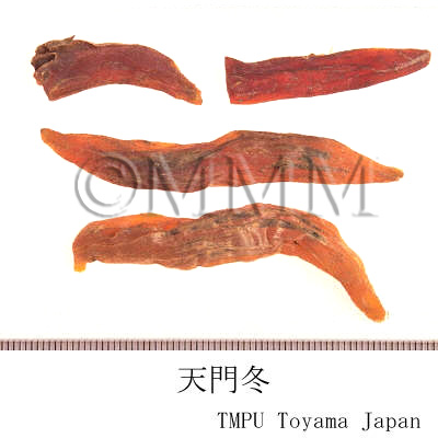 | Remarks | In the market, the root of Asparagus cochinchinensis (Lour.) Merr. (Jap. name: Kusasugikazura) as well as that of A. lucidus Lindl. var. pygmaeus Makino, A. filicinum Ham. (Jap. name: Tachitemmondō) and A. schoberioides Kunth (Jap. name: Kijikakushi) may be distributed. Tianmendong has a strong effect of nourishing the lung and kidney. Maimendong (Ophiopogonis Tuber) has an advantage of clearing away heat and relieving dryness of the lung. Both are applied in the combination for the cough of lung tuberculosis. | |||||