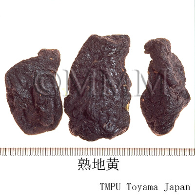 | Remarks | "Shudihuang" is processed with wine: it is made by steaming after mixing with "Huangjiu", a kind of rice wine such as "Shaoxingjiu". Then it is dried by daylight. This process, steaming and drying, is repeated 9 times. Steamed "Shudihuang": it is made by steaming without "Huangjiu". The steaming and drying process is repeated 9 times too. Comparing with "Kanjiō" (Unprepared Rehmannia Root), "Shudihuang" tends to have less or no iridoid glycoside such as catalpol, and has more monosaccharides. | ||||||