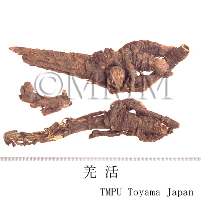 | Remarks | Kenkyōkatsu, produced in Korea, is the root or rhizome of Ostericum koreanum Kitagawa (= Angelica koreana Maxim.) of family Umbelliferae (Jap. name: Chosen'oniudo) or Ostericum grosseserratum Kitagawa (= Angelica uchiyamana Yabe) (Jap. name: Nioiudo). Both Kenkyōkatsu and Chōkyōkatsu, produced in Japan, are the roots or rhizomes of Angelica pubescens Maxim. (Jap. name: Shishiudo). Recently however, Japanese Qianghuo (Jap. name: Wakyōkatsu) is the slender roots of Aralia cordata Thunb. of family Araliaceae. Chinese Qianghuo is the root of genus Angelica of family Umbelliferae. Both Qianghuo and Duhuo (Araliae Cordatae Rhizoma) have benefits of expelling wind and removing dampness. They relieves pain and removes palsy as well. Qianghuo is a medicine of Taiyang meridians. It has the advantage of expelling dryness and diaphoresis, and should be used for exterior syndrome due to wind cold, while Duhuo has no effect of diaphoresis. Duhuo is a drug of Yin Minimum Kidney Meridian, and used with Xixin (Asiasari Radix), which has a beneficial effects on headache resulting from Yin Minor Channel. In ancient times, it was said "Qianghuo cures hives and Duhuo cures latent wind. Qianghuo tends to specialize in the exterior and Duhuo tends to specialize in the interior." | |||||