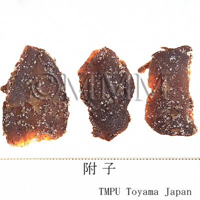 | Remarks | The Pharmacopoeia of the People's Republic of China defines "Fuzi (附子)" as the processed tuber (lateral roots) of Aconitum carmichaeli. The processed aconite root, which is compressed and heated, is used for many kinds of Kampo drug products. Since aconitum alkaloids have strong toxicity, there are many processes to reduce it. It is called "Yanfuzi (塩附子)," "Paofuzi (炮附子)," "Heifupian (黒附片)" or "Baifupian (白附片)" depending on each process. - Chinese "Yanfuzi (塩附子)", the tuber of Aconitum carmichaeli, is half dried after rinsed in the solution of salt water and bittern. - "Paofuzi (炮附子)" is the dried "Yanfuzi (塩附子)" after being peeled and divided lengthwise. - Both "Heifupian (黒附片)" and "Refupian (熟附片)" are made as follows : rinse roots in bittern, divide them lengthwise, stain with dye stuff, dry after steaming. - Though "Baifupian (白附片)" is the similar product to "Heifupian (黒附片)", it is barked and smoked by sulfur untill it becomes white at its final process. The Japanese "Shirakawa-bushi," the tuber of Aconitum japonicum, is made as follows : rinse it in salt water, coat with lime and dry. It is mentioned in the Japanese Pharmacopoeia that there are three ways in processing the aconite tuber. 1: Autoclaving. 2: Heating or autoclaving after rinsing in salt or rock salt solution. 3: Treating with calcium hydroxide after rinsing in salt solution. | ||||||