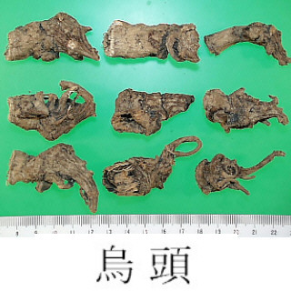 | Clinical application | As an antispasmodic and painkiller, Wutou is applied for arthritis, numbness of limbs and abdominal pain of sickly person. It is also used as diuretic and tonic. | ||||||