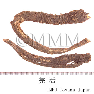 Chinese Qianghuo is the root of genus Angelica of family Umbelliferae. Both Qianghuo and Duhuo (Araliae Cordatae Rhizoma) have benefits of expelling wind and removing dampness. They relieves pain and removes palsy as well. Qianghuo is a medicine of Taiyang meridians. It has the advantage of expelling dryness and diaphoresis, and should be used for exterior syndrome due to wind cold, while Duhuo has no effect of diaphoresis. Duhuo is a drug of Yin Minimum Kidney Meridian, and used with Xixin (Asiasari Radix), which has a beneficial effects on headache resulting from Yin Minor Channel. In ancient times, it was said "Qianghuo cures hives and Duhuo cures latent wind. Qianghuo tends to specialize in the exterior and Duhuo tends to specialize in the interior."