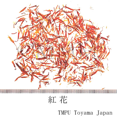 | Remarks | Qianhua (錢花) is the flower, being pressed and dried after harvesting. Banhonghua (板紅花) is the plate-like one which is made by pressing many flowers together and used for manufacturing Yanzhi (臙脂, Jap. name: Beni). For medicinal use, the dried one without pressing is high quality. Yanzhi is used for both lip stick and certified color. The seeds are the main raw material for safflower oil. | |||||