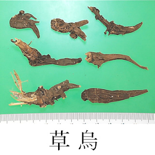 Remarks- The tubers of wild Aconitum have respective names depending on the production area and species, as follows: Sōuzu (Jap. name), Caowu, Wuyao, Jinniuqi, Dacaowu, Xiaoheiniu, Xuewu, Huangcaowu, Tengcaowu, Wanwuyao, Kaenshi (Jap. name), Tiebangchui.