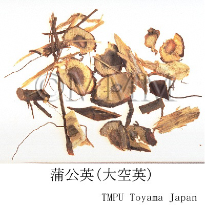 | Remarks | The Pharmacopoeia of the People's Republic of China defines (2020 edi.) defines the whole plant of Taraxacum mongolicum Hand.-Mazz. (Jap. name: Mōko-tampopo), T. borealisinense Kitam. (Jap. name: Shina-tampopo) as "Pugongying" (蒲公英). Others are T. erythropodium Kitag., T. ceratophorum DC., T. pseudo-albidum Kitag., T. pseudo-albidum Kitag. var. lutescens Kitag., T. ohwianum Kitam., T. dissectum Ledeb., T. asiaticum Dahlst., T. cuspidatum Dahlst., T. officinale Weber (Jap. name: Seiyō-tampopo) etc. The above plants are mainly used in northeastern and northern China. TMany commercial products are found to be contaminated. In southern China, the whole plant of Emilia sonchifolia (L.) DC. of family Compositae (Jap. name: Usubeninigana) or Elephantopus scaber L. is known as "Pugongying" or "Tugongying" (土公英) and used. In Yunnan Province, Picris divaricata Vent. is referred to as "Pugongying". In Taiwan, the whole plant of Ixeris chinensis (Thunb.) Nakai (Jap. name: Usagiso) is called "Pugongying". The whole plant of I. laevigata (Blume) Sch.-Bip. ex Maxim. var. oldhami (Maxim.) Kitam. (Jap. name: Atsubanigana) is also used in the same way. The Korean "Pugongying" is mainly the whole plant of T. mongolicum Hand.-Mazz. var. corniculatum Nakai (JP name: Keirin-tampopo), or T. asiaticum Dahlst. etc. In rare cases, the roots are also sold as "Pugongying-gen". In Japan, it is mainly the roots of T. japonicum Koidz. (Jap. name: Kansai-tampopo) and T. officinale, and is called "Hokōeikon" (Pugongying-gen). | ||||||
