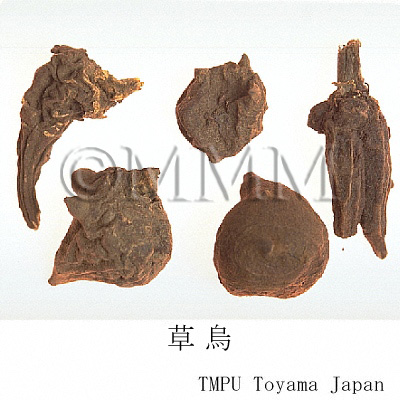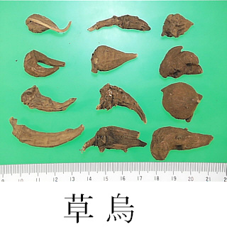 | Remarks | - The tubers of wild Aconitum have respective names depending on the production area and species, as follows: Sōuzu (Jap. name), Caowu, Wuyao, Jinniuqi, Dacaowu, Xiaoheiniu, Xuewu, Huangcaowu, Tengcaowu, Wanwuyao, Kaenshi (Jap. name), Tiebangchui. - Various kinds of Chinese Souzu: A. kusnezoffii (Heilongjiang), A. artemisaefolium Bar. et Skv. (Liaonig), A. paniculigerum Nakai, A. sczukini Turcz. (Northeast part), A. taipeicum Hand.-Mazz. (Shaanxi), A. karakolicum Rap., A. soongaricum Stapf (Xinjiang), A. sungpanense Hand.-Mazz. (Shaanxi, Gansu, Sichuan), A. hemsleyanum Pritz. (Sichuan, Hubei, Hunan, Shaanxi), A. stylosum Stapf, A. transsectum Diels, A. delavayi Franch. (Yunnan) and many other tubers of genus Aconitum. - Korean Sōuzu: Tubers of several Aconitum genus such as A. triphyllum Nakai (Jap. name: Mitsubatorikabuto). - Japanese Sōuzu: The tuber of A. japonicum Thunb. - The Pharmacopoeia of The People's Republic of China contains Chuanwu, the parent root of A. carmichaeli (harvested from late June to early August), and Caowu, the tuber of A. kusnezoffii (harvested in Autumn). Caowu is stronger in both toxicity and benefit than Chuanwu. Compared with Fuzi, Wutou has advantages of expelling wind and relieving pain, and has disadvantages of stimulating heart and dispelling cold. | ||||||