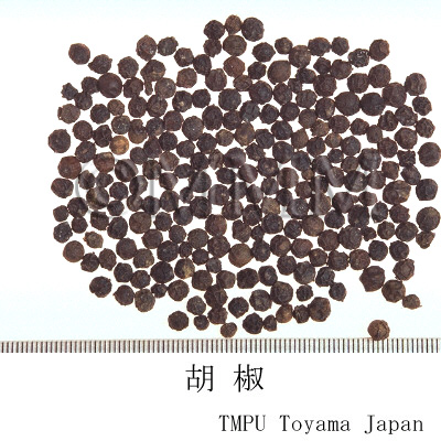 | Remarks | Black pepper is the dried immature fruit. White pepper is the dried mature fruit after removing the epicarp. Black pepper: Eared immature fruits are harvested. Then the fruit is separated from the ear by hand kneading, immersed in boiling water until the surface turns to black, lifted from the water and dried. White pepper: Mature fruits are bagged and immersed in flowing water for a week. Then the pericarp and sarcocarp are removed. The remaining seed is dried. Alternatively, it is made by just removing the pericarp and sarcocarp of Black pepper. Hujiao originally came from Southern India to Europe in about B.C.400, and to China in Tang Dynasty. Hujiao opened the Age of Geographical Discovery (the era started by the discovery of shipping route to India). At the time, during late 15th to 16th century, its value was equivalent to gold. | |||||
