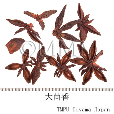 | Remarks | - The benefit of Bajiaohuixiang (Jap. name: Daiuikyō) resembles Xiaohuixiang (Jap. name: Shouikyō). However, Daiuikyō has the heat property which warms the organs strongly, dispels cold and relieves pain. - The fruit of Ilicium religiosum Sieb. et Zucc. (Jap. name: Shikimi), produced in Japan, is the congener of Daiuikyō. Though it resembles Daiuikyō closely, it has a toxic component anisatin. Therefore, it must not be mixed with Daiuikyō. | |||||