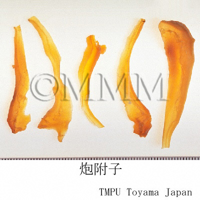 - "Paofuzi (炮附子)" is the dried "Yanfuzi (塩附子)" after being peeled and divided lengthwise.